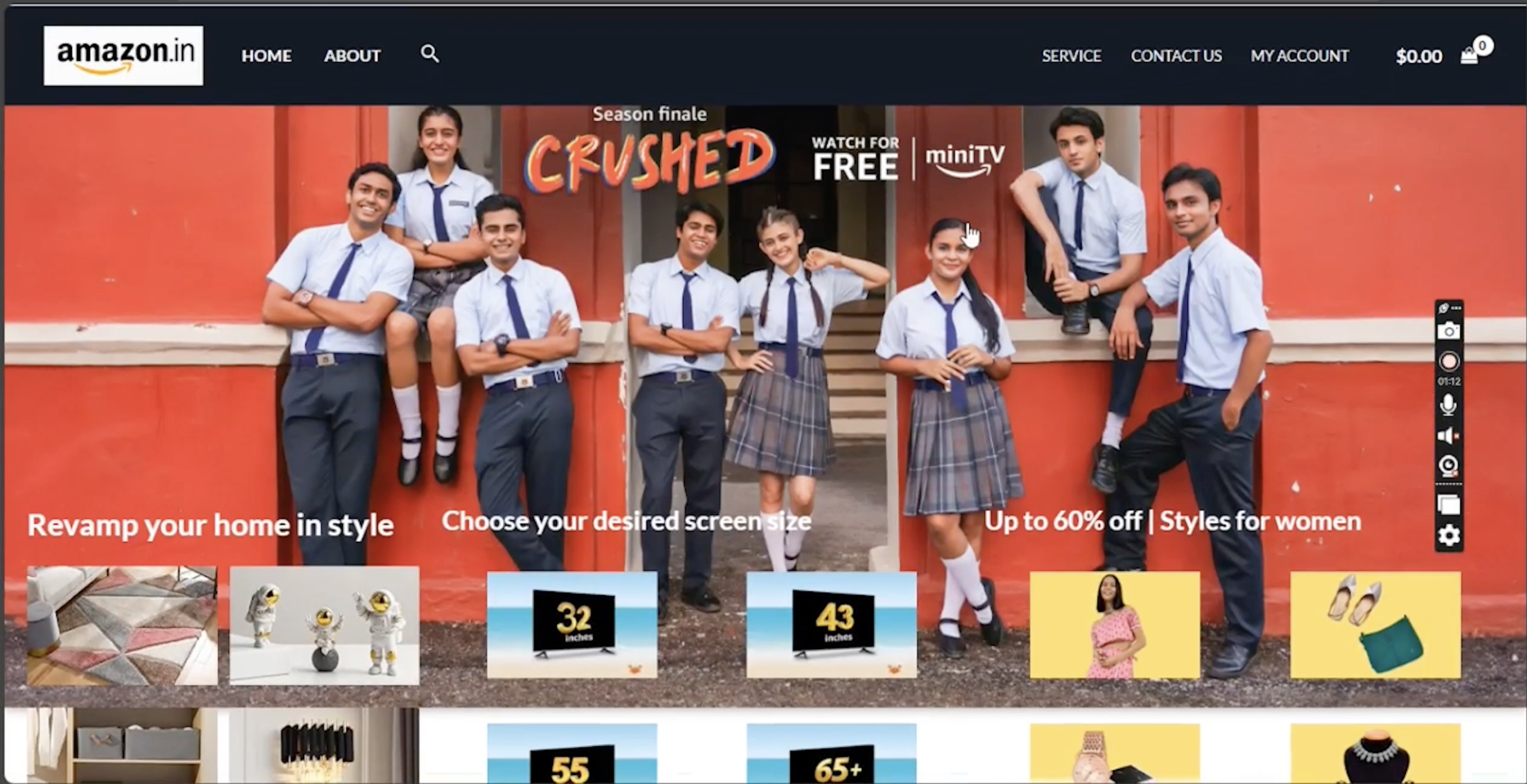 The homepage focuses on user engagement and easy navigation, with a top navigation bar containing account options, services, and cart details. Promotional sections such as discounts, featured products, and category-based shopping options are visually emphasized to replicate a real-world e-commerce experience.